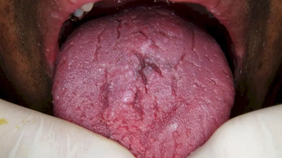 Candidíase ou “língua careca” (doença infecciosa causada por fungo):